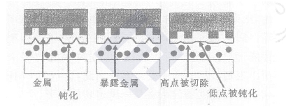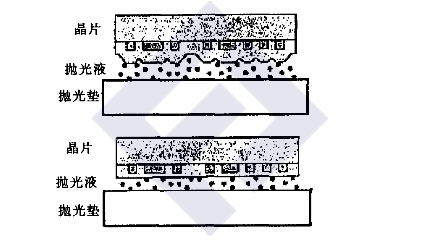 拋光液所含的化學劑和晶片表面互相作用,然后磨粒沖擊晶片表面獲得機械切除。化學作用在難于被磨損的金屬CMP尤為重要,在金屬拋光的拋光液中可以包含強的刻蝕劑和氧化劑,對金屬產生強沖擊和溶解,另外拋光液中還可以包含鈍化劑以保護表層,比如在銅的拋光中,刻蝕和鈍化的聯(lián)合作用可以形成效率的平整表面。